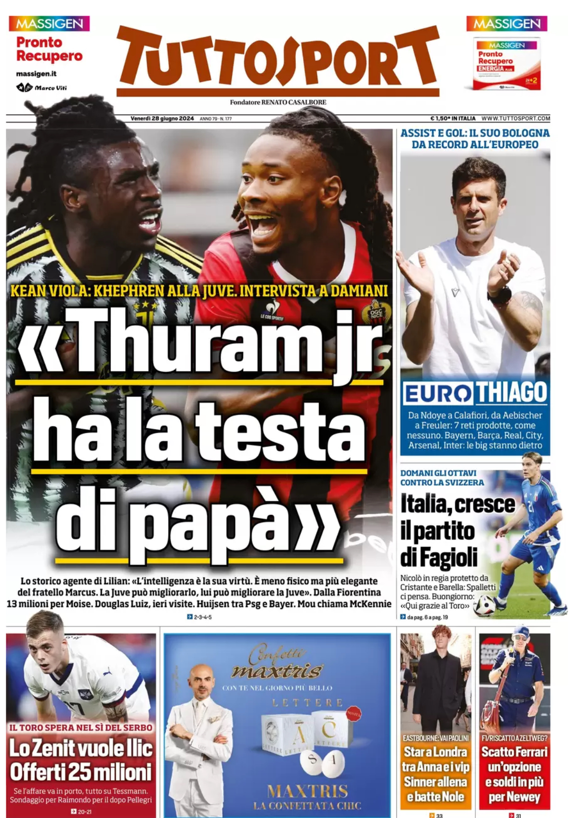 “Thuram jr ha la testa di papà”. Titola così al centro l’edizione odierna di Tuttosport che apre con l’intervista a Oscar Damiani che parla del centrocampista del Nizza e di Kean alla Fiorentina. Di spalla la Fiorentina: "Italia, cresce il partito di Spalletti". In basso il Torino: "Lo Zenit vuole Ilic. Offerti 25 milioni".