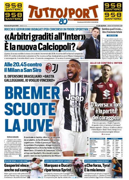 Partita molto importante per la Juventus. La squadra di Luciano Spalletti sarà ospite del Milan questa sera per conquistare punti importanti in vista della qualificazione alla prossima Champions League. Questo il titolo in prima pagina dell'edizione odierna di Tuttosport: "Bremer scuote la Juve".