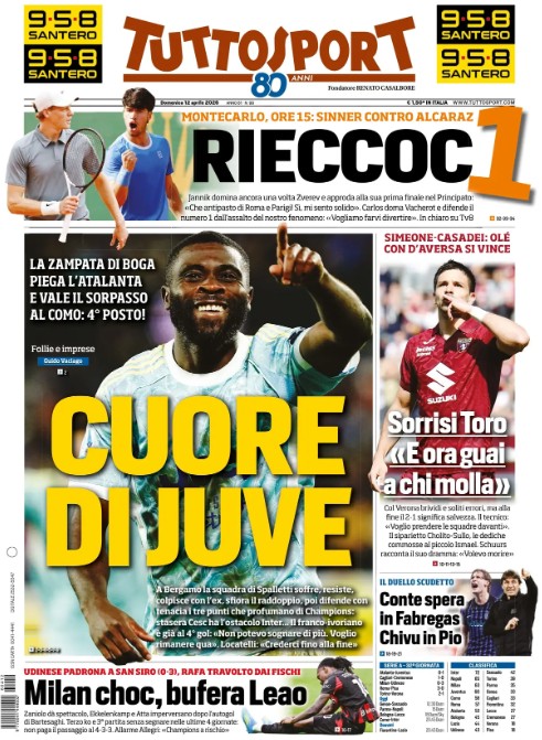 "Cuore di Juve". E' questo il titolo d'apertura di Tuttosport all'indomani del successo dei bianconeri in casa dell'Atalanta. Spazio anche alla sconfitta del Milan, in casa contro l'Udinese, con il seguente titolo in taglio basso: "Milan choc, bufera Leao". E poi sul Napoli: "Conte spera in Fabregas, Chivu in Pio".
