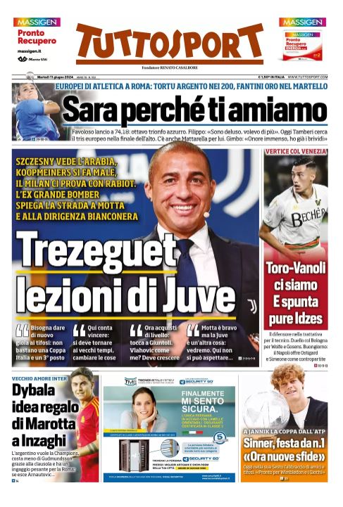 "Trezeguet: lezioni di Juve", titola in prima pagina il quotidiano torinese Tuttosport riferendosi alle dichiarazioni dell'ex attaccante bianconero. Il soommario: "Szczesny vede l'Arabia, Koopmeiners si fa male, il Milan ci prova con Rabiot. L'ex grande bomber spiega la strada a Motta e alla dirigenza bianconera". Un box in taglio basso è dedicato alla situazione della Joya: "Dybala idea regalo di Marotta a Inzaghi". Di seguito la prima pagina integrale