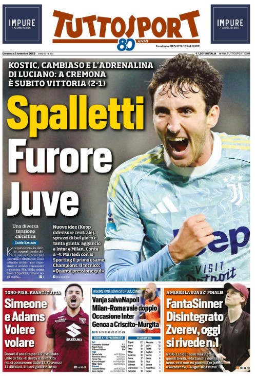 Inizia con il piede giusto l'avventura di Spalletti sulla panchina della Juventus. I bianconeri hanno superato 2-1 la Cremonese con i gol iniziali di Kostic e Cambiaso mentre nel finale Jamie Vardy ha accorciato le distanze. Questo il titolo a riguardo dell'edizione odierna di Tuttosport "Spalletti, furore Juve".