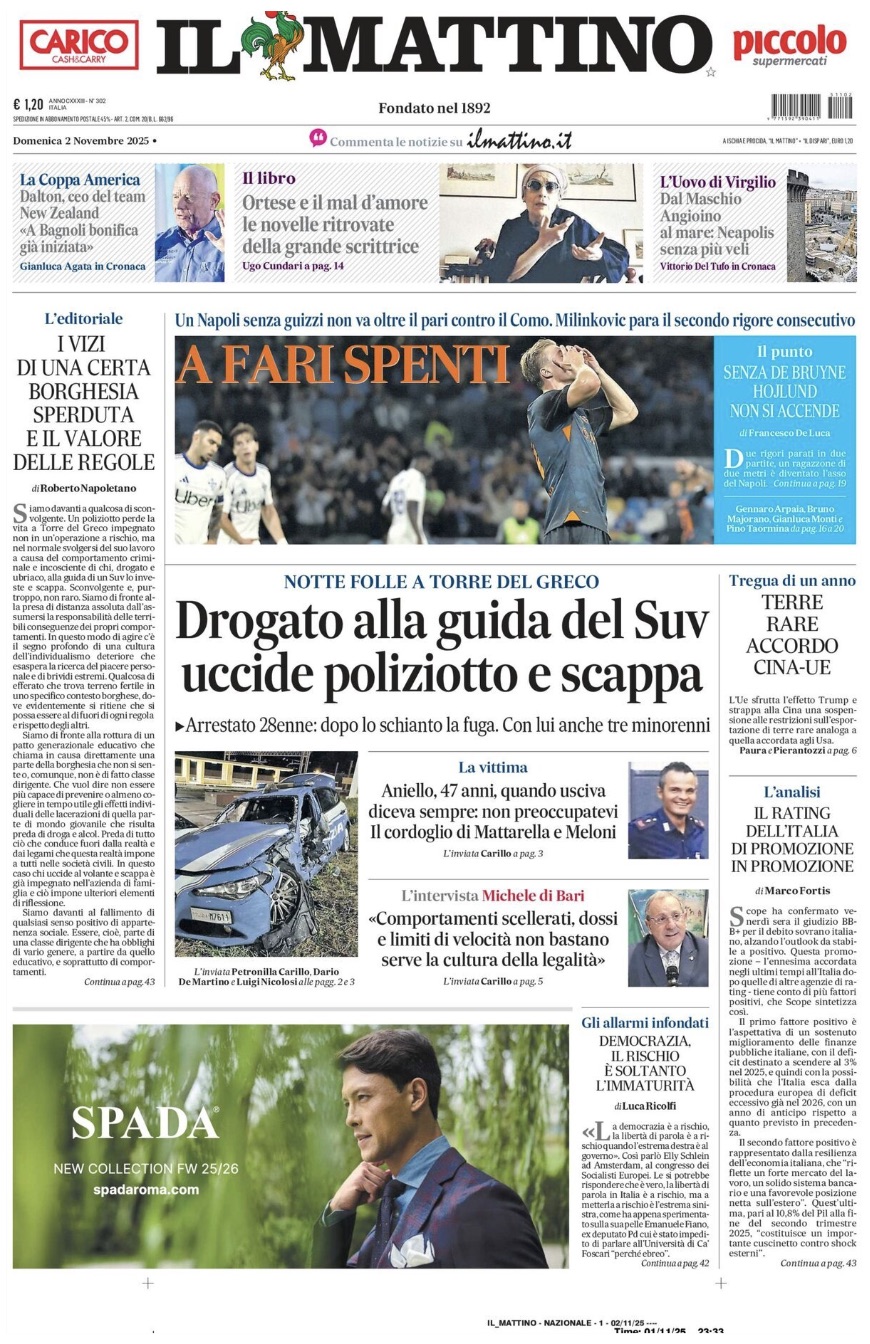 "A fari spenti", apre così in prima pagina Il Mattino nell'edizione odierna, commentando lo 0-0 maturato dalla squadra di Conte contro quella di Fabregas al Maradona. Il sommario: "Un Napoli senza guizzi non va oltre il pari contro il Como. Milinkovic para il secondo rigore consecutivo". Di seguito la prima pagina integrale.
