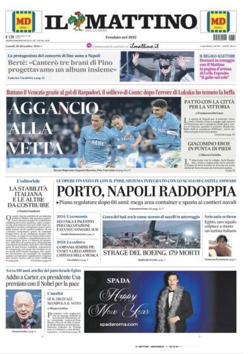 "Aggancio alla vetta", titola così in prima pagina Il Mattino nell'edizione odierna, parlando della vittoria del Napoli che sfrutta il pari dell'Atalanta per tornare al primo posto. Il sommario: "Battuto il Venezia grazie al gol di Raspadori, il sollievo di Conte: «Dopo l'errore di Lukaku ho temuto la beffa»". Di seguito la prima pagina integrale.