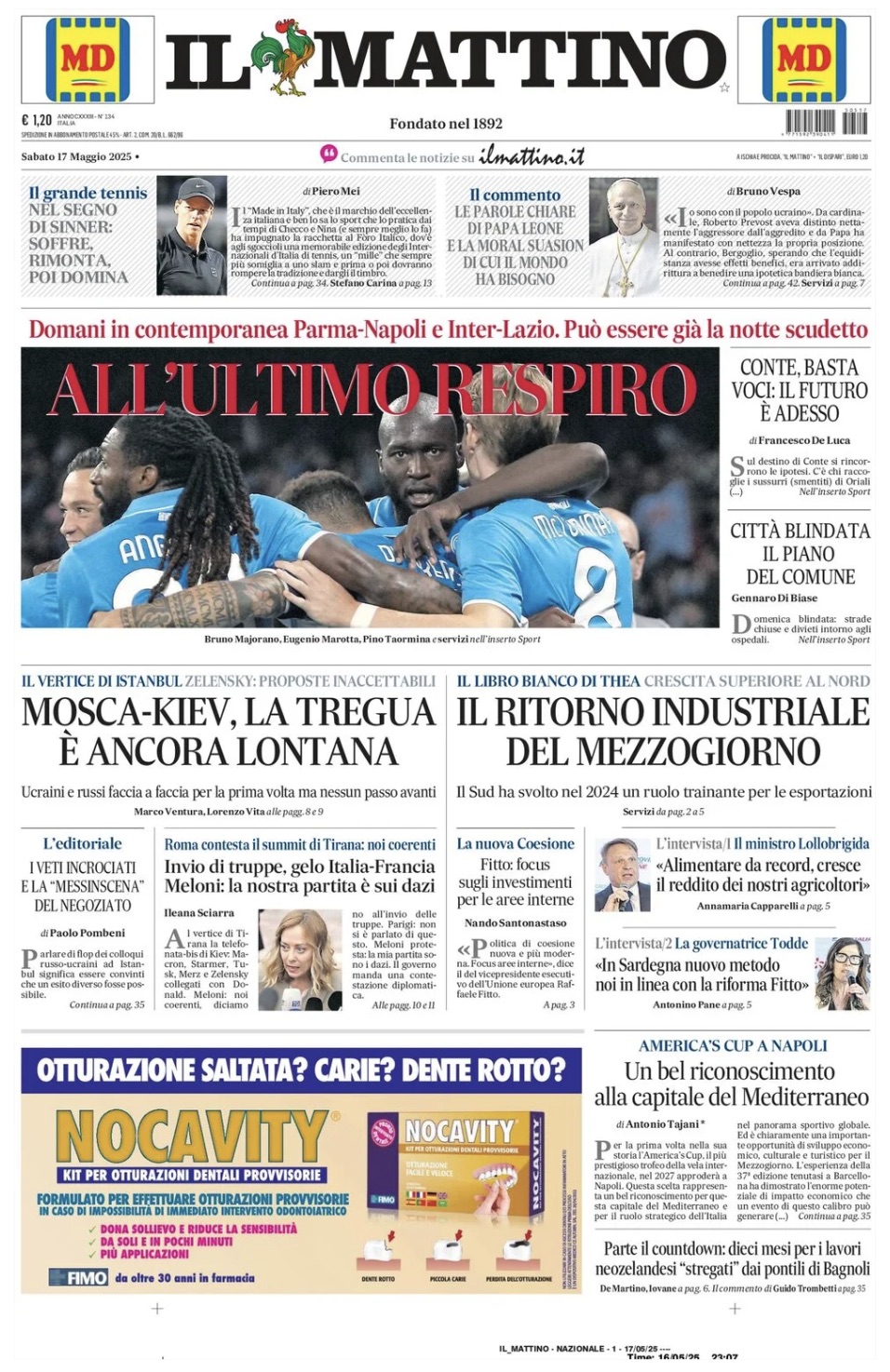 "All'ultimo respiro", apre così in prima pagina Il Mattino nell'edizione odierna, parlando della combattuta lotta al titolo tra la squadra di Conte e quella di Inzaghi. Il sommario: "Domani in contemporanea Parma-Napoli e Inter-Lazio. Può essere già la notte scudetto". Di seguito la prima pagina integrale.