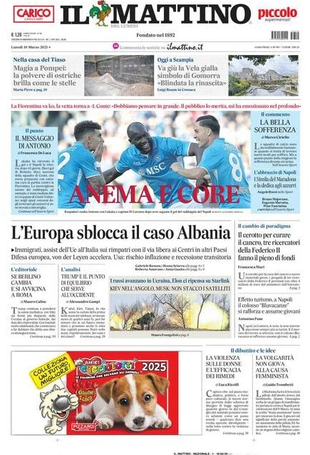 Nell'edizione odierna, Il Mattino dedica l'apertura in prima pagina al ritorno alla vittoria del Napoli, che batte 2-1 la Fiorentina e si riporta a -1 dall'Inter: "Anema e Core. La Fiorentina va ko, la vetta torna a -1. Conte: 'Dobbiamo pensare in grande. Il pubblico lo merita, mi ha emozionato nel profondo". Di seguito la prima pagina integrale.