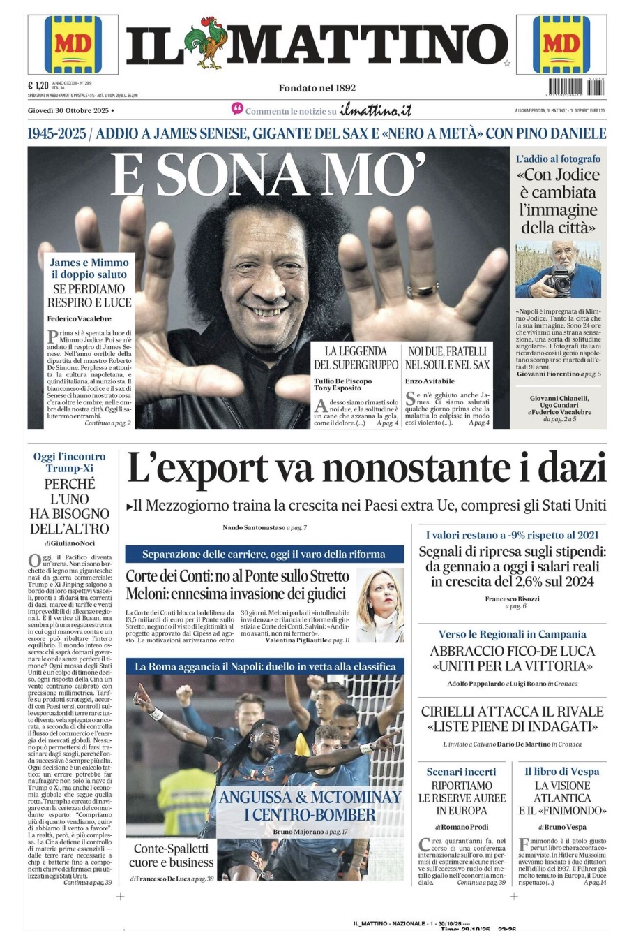 "Anguissa e McTominay: i centro-bomber", scrive così in prima pagina Il Mattino nell'edizione odierna, in riferimento ai due centrocampisti azzurri che continuano a segnare gol su gol. Il sommario: "La Roma aggancia il Napoli: duello in vetta alla classifica". Al centro, l'omaggio in memoria di James Senese: "E sona mo'. Addio a James Sense, gigante del sax e 'Nero a metà' con Pino Daniele". Di seguito la prima pagina integrale.