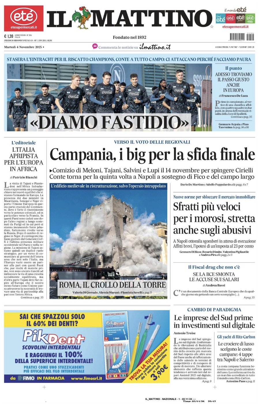 Nella prima pagina odierna Il Mattino apre con la frase forte pronunciata da Antonio Conte in conferenza stampa: "Diamo fastidio". Il sommario: "Stasera l'Eintracht per il riscatto Champions, Conte a tutto campo: 'Ci attaccano perché facciamo paura'". Di seguito la prima pagina integrale.