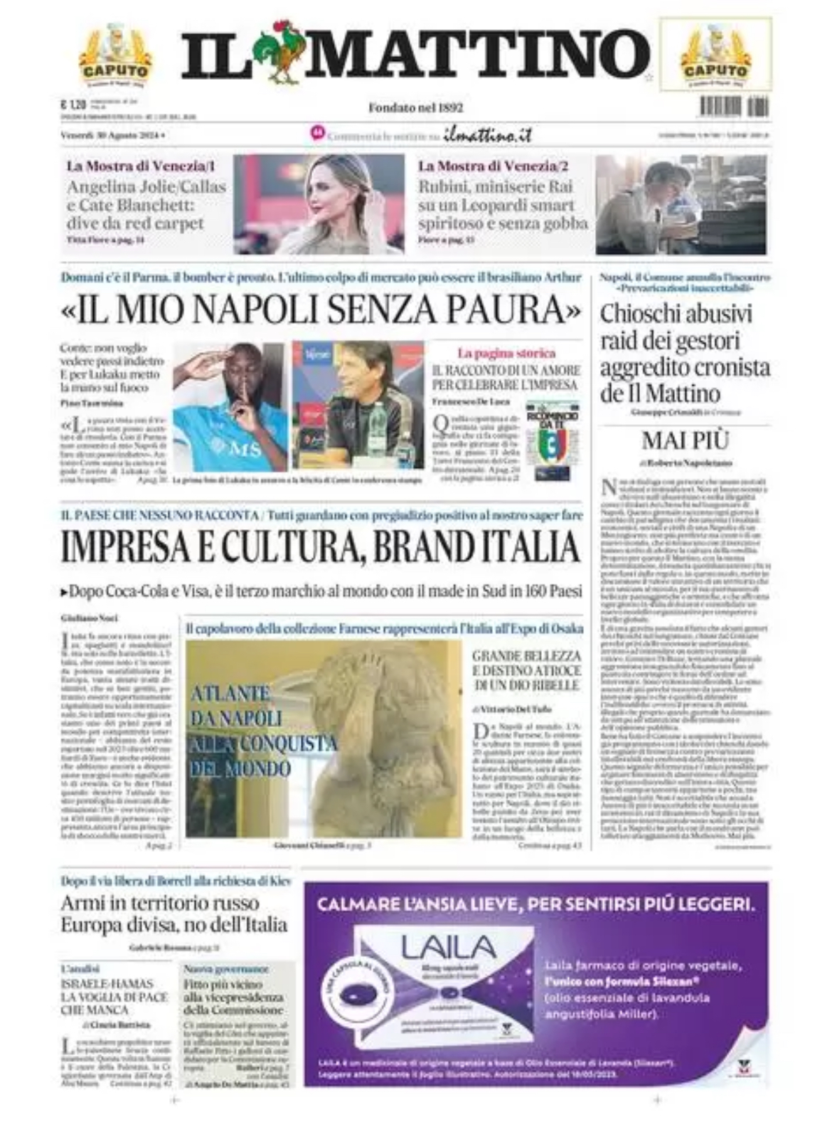 Nell'edizione di oggi, Il Mattino dedica ampio spazio in prima pagina alle parole in conferenza stampa di Antonio Conte, ma anche dell’arrivo di Romelu Lukaku e del mercato del Napoli: “‘Il mio Napoli senza paura. Non voglio vedere passi indietro. E per Lukaku metto la mano sul fuoco’. Domani c’è il Parma, il bomber è pronto. L’ultimo colpo di mercato può essere il brasiliano Arthur”.