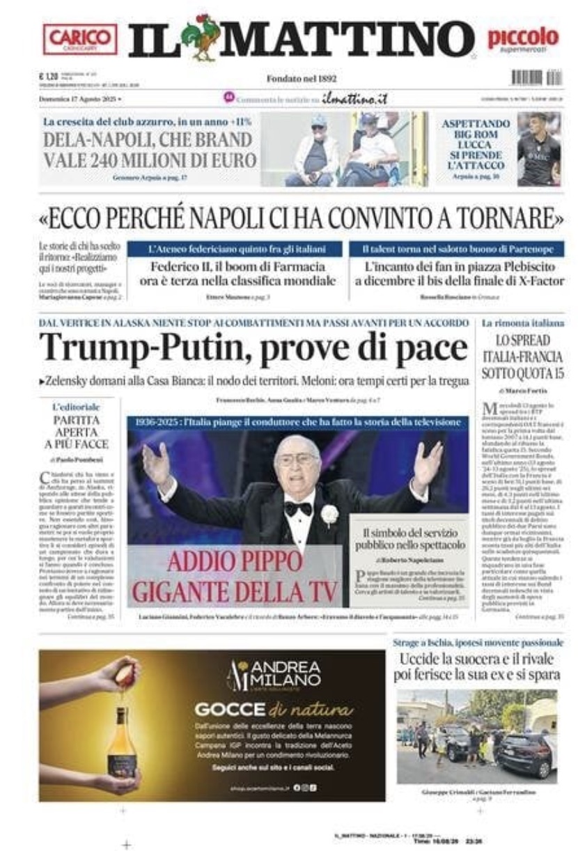 "Aspettando Big Rom, Lucca si prende l'attacco", scrive così Il Mattino nel taglio alto della prima pagina di oggi, parlando della situazione centravanti in casa Napoli. Un altro box è dedicato alla crescita del brand: "DeLa-Napoli, che brand: vale 240 milioni di euro. La crescita del club azzurro, in un anno +11%". Di seguito la prima pagina integrale.