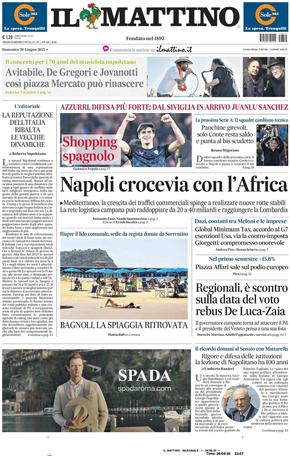 Nell'edizione di oggi, Il Mattino dedica spazio al mercato del Napoli in prima pagina: "Shopping spagnolo. Azzurri, difesa più forte: dal Siviglia in arrivo Juanlu Sanchez". Di spalla spazio alla panchine della prossima Serie A con 12 squadre che cambiano tecnico: "Panchine girevoli, solo Conte resta saldo e punta al bis scudetto". Di seguito la prima pagina integrale.