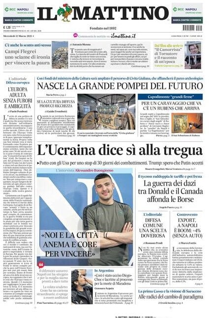 Nell'edizione di oggi, Il Mattino dedica ampio spazio in prima pagina all'intervista in esclusiva al difensore del Napoli Alessandro Buongiorno: "Noi e la città Anema e Core per vincere". In taglio basso spazio al progesso in Argentina per la morte di Diego Armando Maradona: "'Così è stato ucciso Diego'. Choc e lacrime al processo per la morte di Maradona". Di seguito la prima pagina integrale.