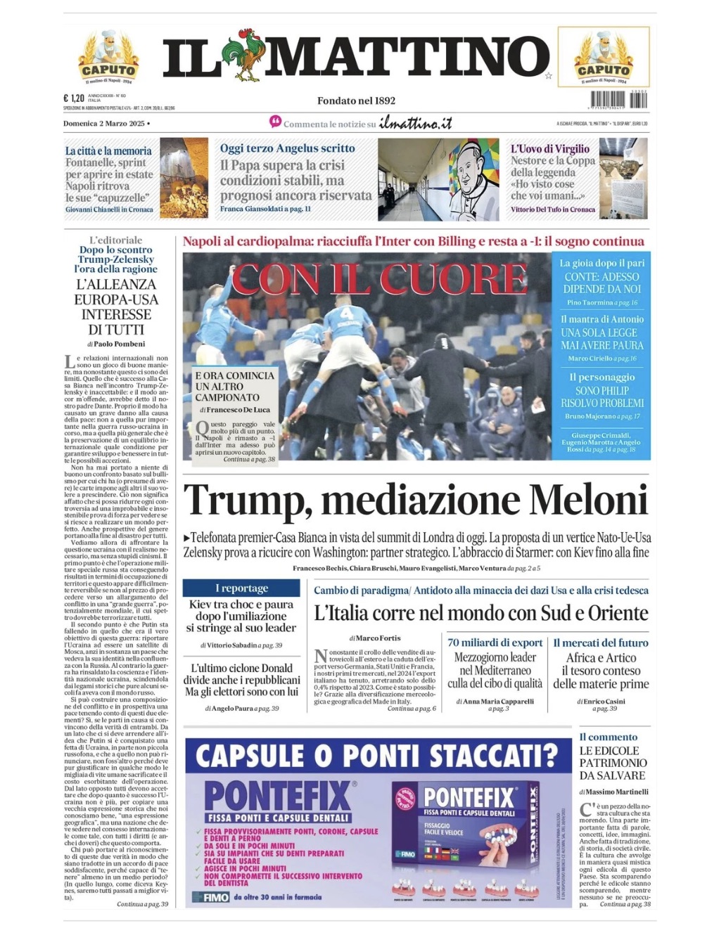 "Con il cuore", scrive così in prima pagina il quotidiano Il Mattino nell'edizione odierna, in riferimento al pareggio agguantato nel finale dagli uomini di Conte contro l'Inter capolista. Il sommario: "Napoli al cardiopalma: riacciuffa l'Inter con Billing e resta a -1: il sogno continua". Di seguito la prima pagina integrale.