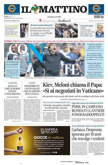 Nell'edizione di oggi, Il Mattino dedica l'apertura in prima pagina ad Antonio Conte, secondo il quotidiano il tecnico del Napoli riflette sul proprio futuro: "Con te. Febbre a 90*. Il tecnico riflette, De Laurentiis pronto alla riconfema. Anche piazza Mercato si tinge d'azzurro". In taglio alto spazio alla scomparsa di Nino Benvenuti: "Addio a Benvenuti, passato dal ring alla leggenda". Di seguito la prima pagina integrale.