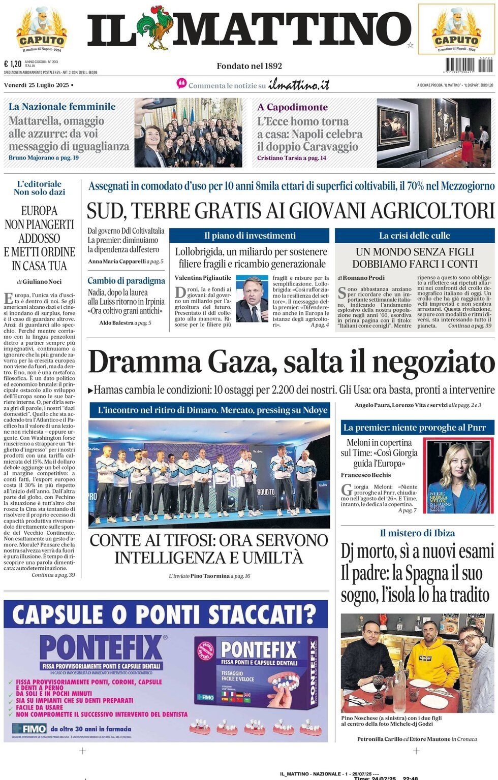 Nell'edizione di oggi, Il Mattino dedica ampio spazio alle dichiarazioni di Antonio Conte nell'incontro classico con i tifosi a Dimaro-Folgarida: "Conte ai tifosi: ora servono pazienza e umiltà". Per quanto riguarda il mercato degli azzurri: "Pressing su Ndoye". Di seguito la prima pagina integrale.