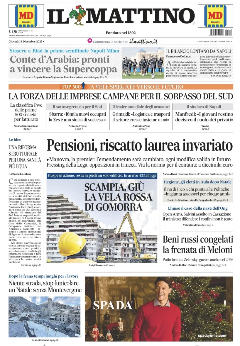 "Conte d'Arabia, pronti a vincere la Supercoppa", scrive così in prima pagina Il Mattino nell'edizione odierna, presentando il match che stasera attende gli azzurri contro i rossoneri, in palio ci sarà la qualificazione alla finale del torneo. Il sommario: "Stasera a Riad la prima semifinale Napoli-Milan". Di seguito la prima pagina integrale.
