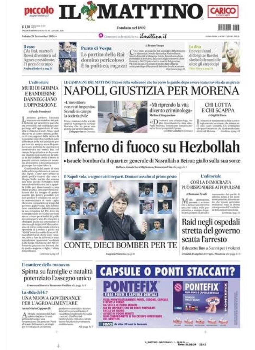 "Conte, dieci bomber per te", apre così in prima pagina l'edizione odierna de Il Mattino, facendo riferimento al numero di uomini azzurri già andati a segno, una cifra alta considerando la stagione appena iniziata. Il sommario: "Il Napoli vola, a segno tutti i reparti. Domani assalto al primo posto". Di seguito la prima pagina integrale.