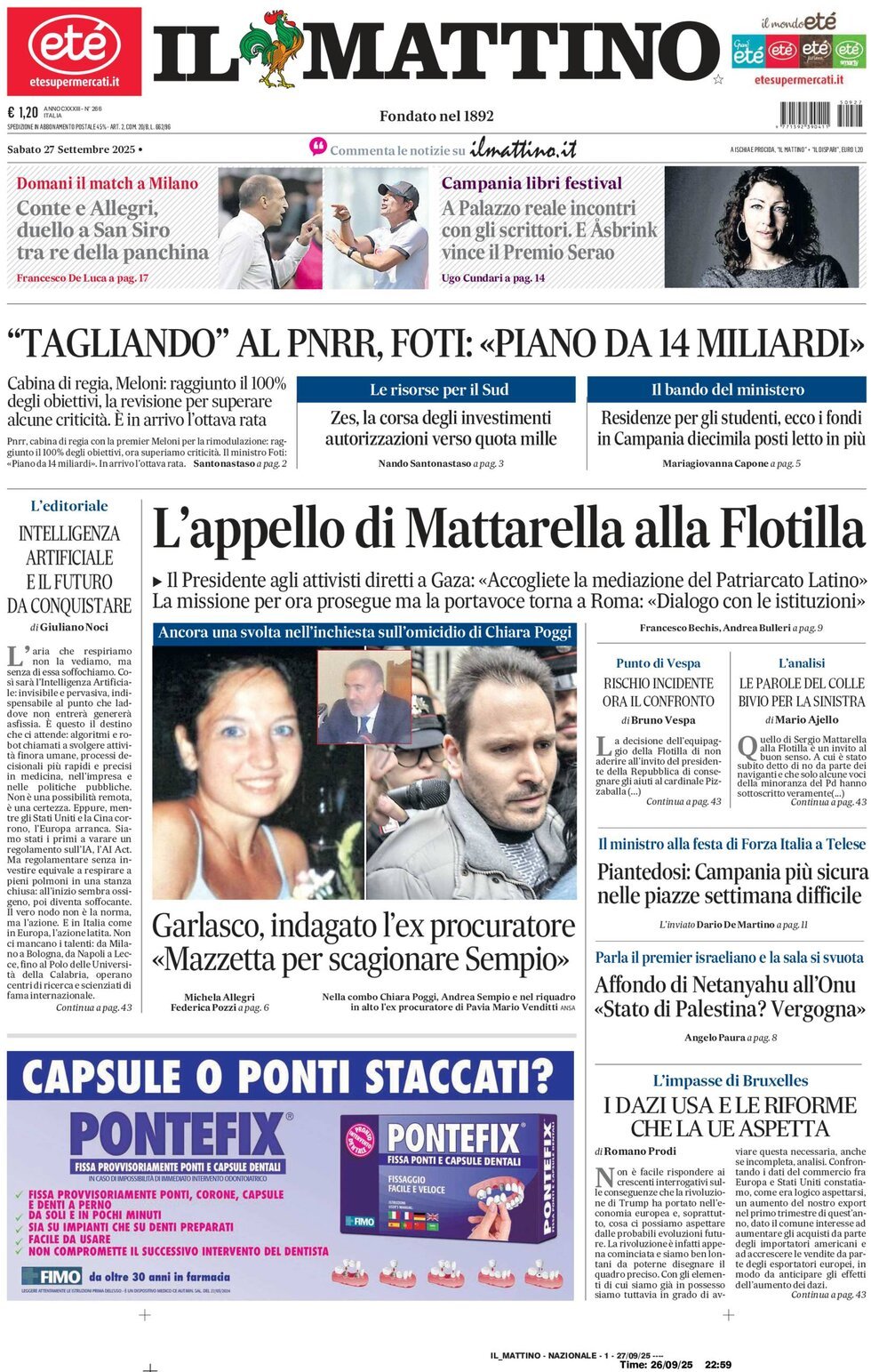 Nell'edizione di oggi, Il Mattino dedica spazio in prima pagina alla sfida tra Milan e Napoli di domani sera a San Siro, posticipo della quinta giornata di Serie A: "Conte e Allegri, duello a San Siro tra re della panchina". Di seguito la prima pagina integrale.