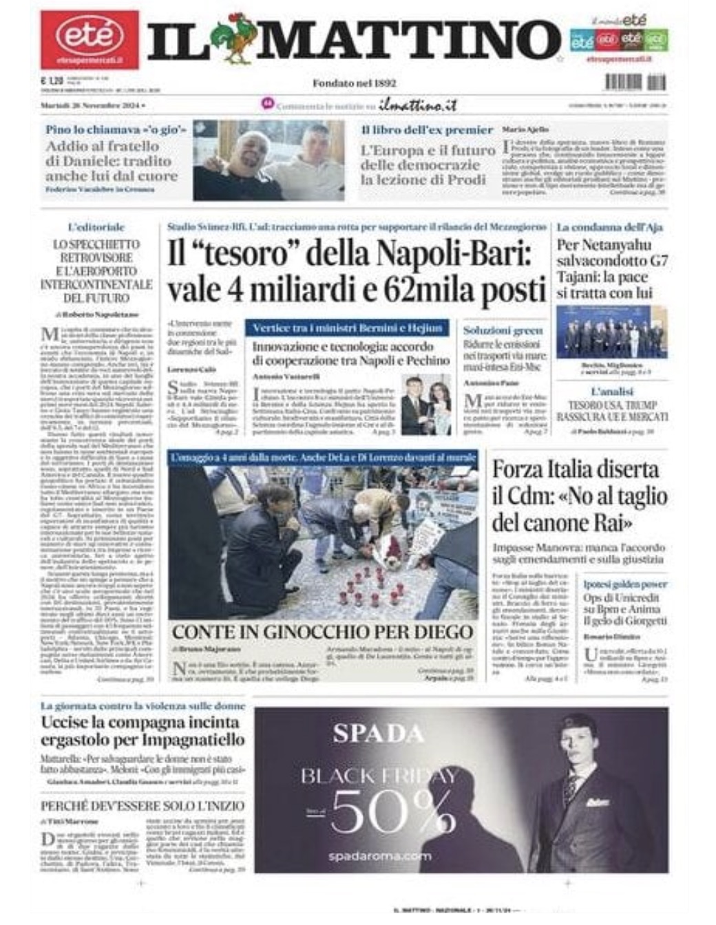 "Conte in ginocchio per Diego", apre così in prima pagina l'edizione odierna de Il Mattino, parlando della visita dell'allenatore del Napoli a Largo Maradona in occasione dell'anniversario della sua scomparsa. Il sommario: "L'omaggio a 4 anni dalla morte. Anche DeLa e DI Lorenzo davanti al murale". Di seguito la prima pagina integrale.