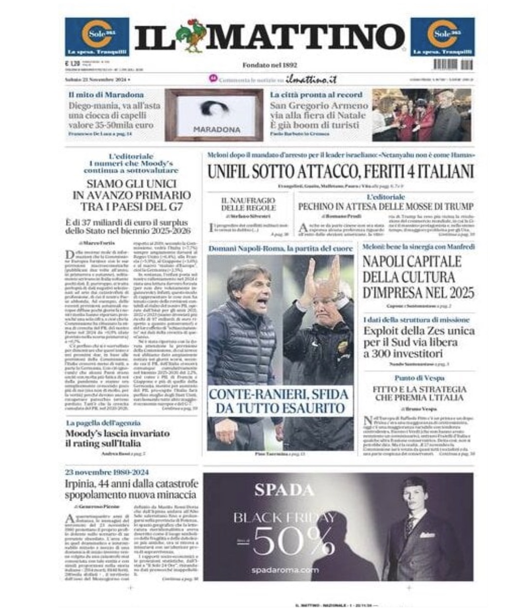 "Conte-Ranieri, sfida da tutto esaurito", scrive così in prima pagina l'edizione odierna de Il Mattino, parlando della sfida di Serie A tra gli azzurri e i giallorossi. Il sommario: "Domani Napoli-Roma, la partita del cuore". In alto, spazio anche ad un curioso episodio legato alla leggenda Diego Armando Maradona: "Diego-mania, va all'asta una ciocca di capelli: valore 35-50 mila euro. Il mito di Maradona". Di seguito la prima pagina integrale.