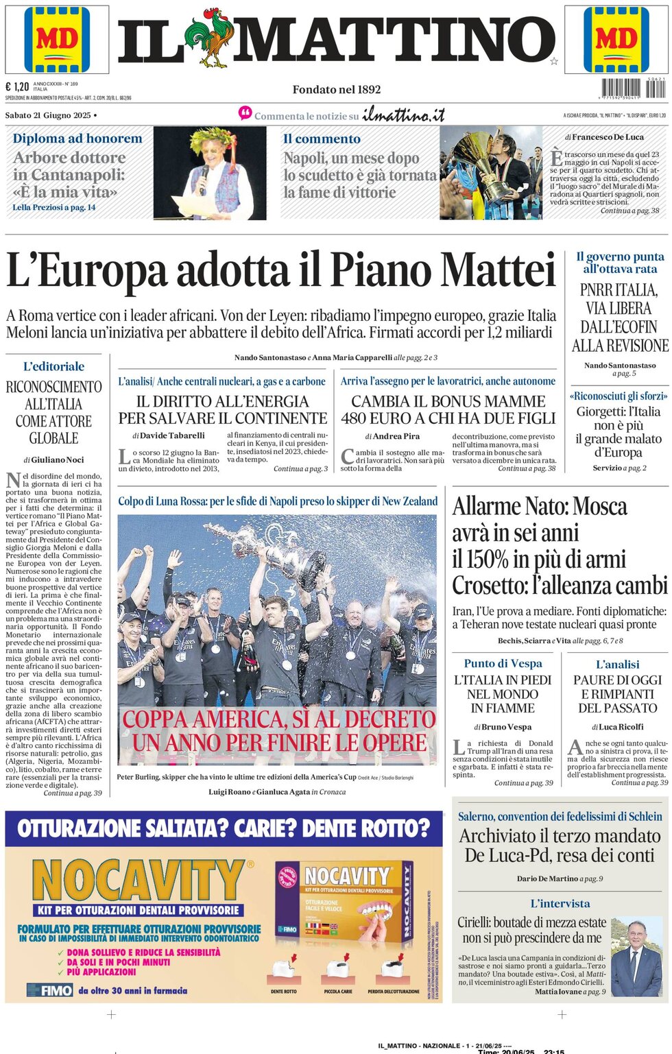 Nell'edizione di oggi, Il Mattino dedica spazio in prima pagina all'America's Cup di vela che si terrà a Napoli nel 2027: "Coppa America, sì al decreto: un anno per finire le opere". In taglio alto spazio al Napoli campione d'Italia: "Napoli, un mese dopo lo scudetto è già tornata la fame di vittorie". Di seguito la prima pagina integrale.
