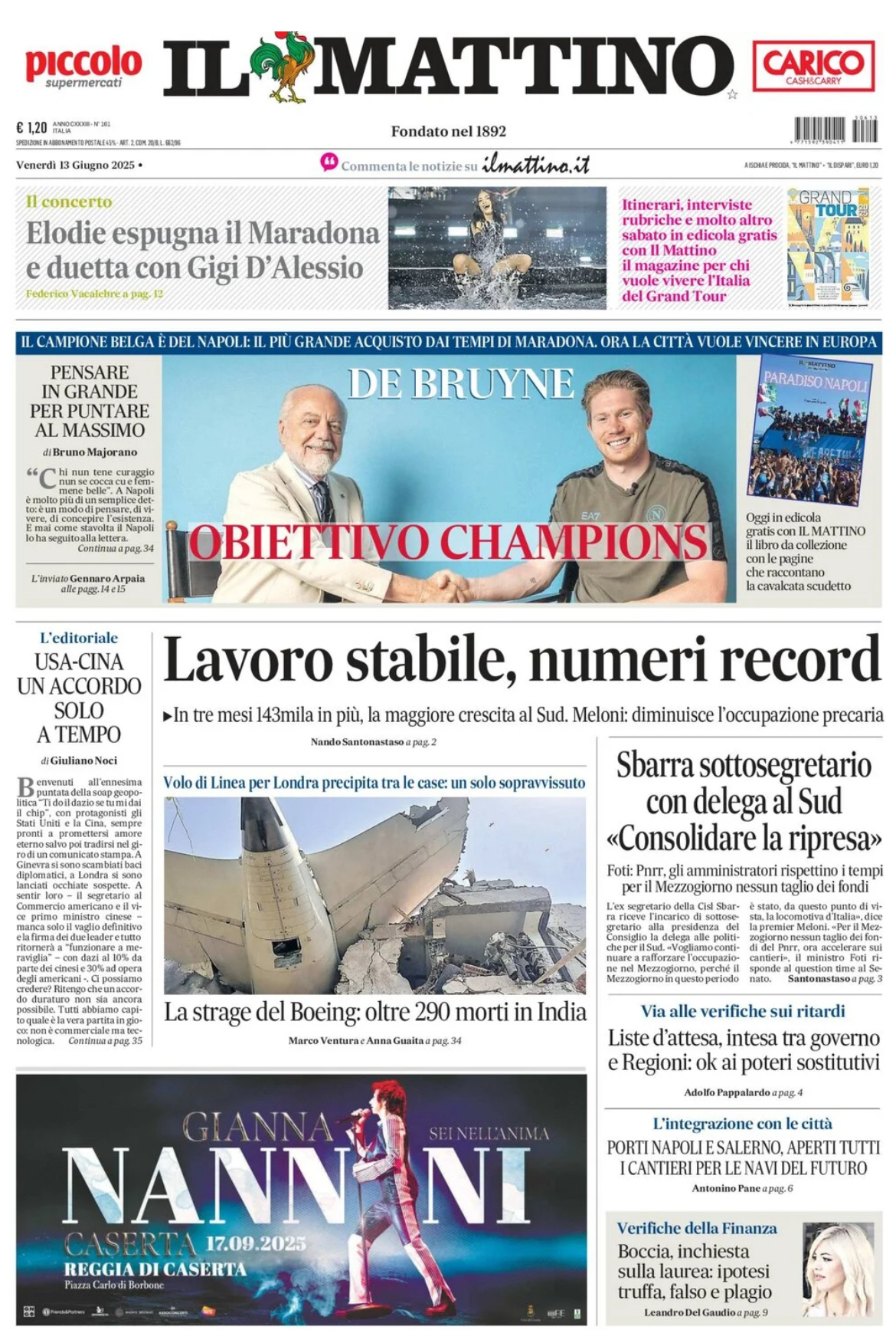 “De Bruyne: obiettivo Champions”. apre così in prima pagina Il Mattino nell'edizione odierna, parlando dell’arrivo ufficiale dell’ex centrocampista del Manchester City. “Il campione belga è del Napoli: il più grande acquisto dai tempi di Maradona, ora la città vuole vincere in Europa”. Di seguito la prima pagina integrale.