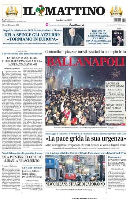 Nell'edizione di oggi, Il Mattino dedica spazio in prima pagina al tweet di Capodanno del presidente del Napoli Aurelio De Laurentiis: "Dela spinge gli azzurri: 'Torniamo in Europa'. Napoli, la missione del 2025. Sabato trasferta a Firenze". In apertura la notte di Capodanno a Piazza Plebiscito: "Balla Napoli". Di seguito la prima pagina integrale.