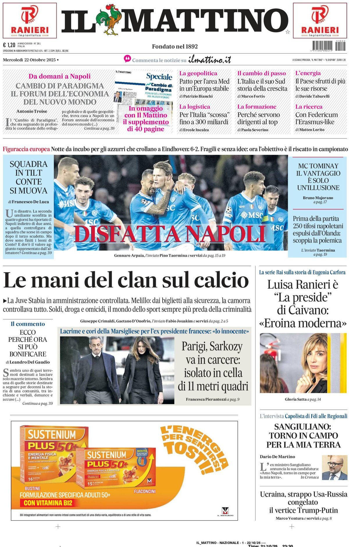 Nell'edizione odierna, Il Mattino apre in prima pagina con la pesantissima sconfitta del Napoli in Champions League contro il PSV Eindhoven: "Disfatta Napoli. Notte da incubo per gli azzurri che crollano a Eindhoven: 6-2. Fragili e senza idee: ora l'obiettivo è il riscatto in campionato". Di seguito la prima pagina integrale.