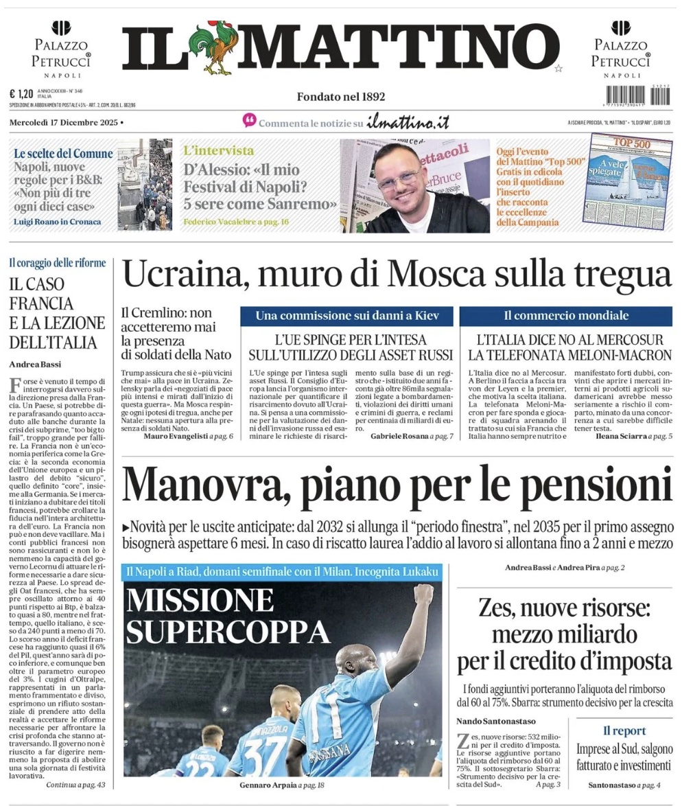"Napoli, missione Supercoppa" scrive l'edizione odierna de Il Mattino in prima pagina. Domani semifinale di Supercoppa italiana a Ryiad contro il Milan di Massimiliano Allegri. Conte con l'incognita Romelu Lukaku , tornato tra i convocati e partito con la squadra in Arabia.