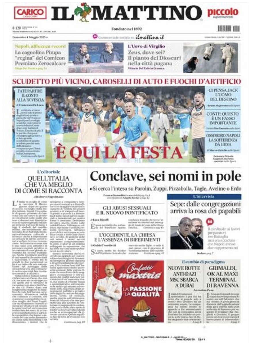 "È qui la festa", apre così in prima pagina Il Mattino nell'edizione odierna, parlando della vittoria del Napoli contro il Lecce che avvicina ancor più il sogno tricolore. Il sommario: "Scudetto più vicino, caroselli d'auto e fuochi d'artificio". Di seguito la prima pagina integrale.