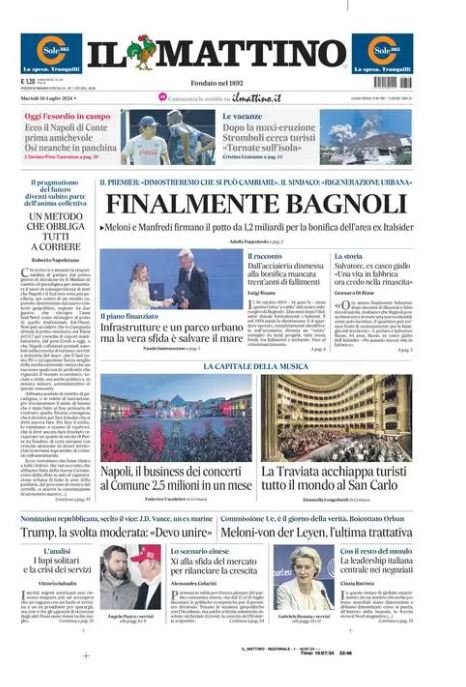 "Oggi l'esordio in campo. Ecco il Napoli di Conte: prima amichevole, Osi neanche in panchina", scrive in prima pagina l'edizione odierna de Il Mattino, parlando del primo test estivo degli azzurri previsto oggi alle ore 18.00 contro l'Anaune Val di Non. Di seguito la prima pagina integrale.