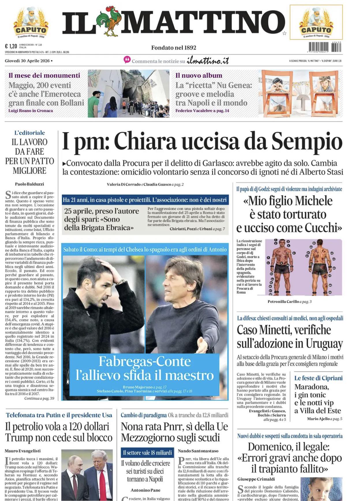 Nell'edizione di oggi, Il Mattino dedica l'apertura in prima pagina all'anticipo della 35ª giornata di Serie A di sabato tra Como e Napoli, sfida anche tra le panchine: "Fabregas-Conte, l'allievo sfida il maestro. Sabato il Como: ai tempi del Chelsea lo spagnolo era agli ordini di Antonio". Di seguito la prima pagina integrale.