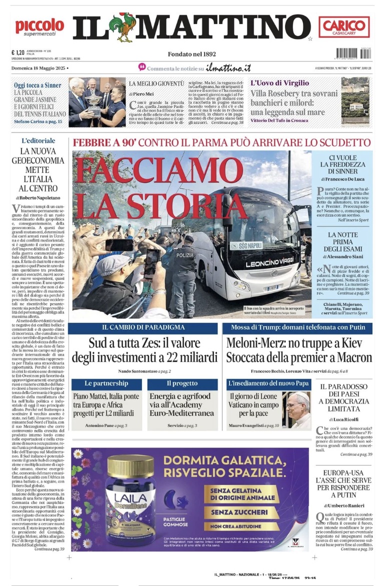 "Facciamo la storia", apre così in prima pagina Il Mattino nell'edizione odierna, parlando della possibilità per il Napoli di vincere il suo quarto campionato già in questo turno, in caso di vittoria al Tardini e sconfitta dell'Inter con la Lazio. Il sommario: "Febbre a 90'. Contro il Parma può arrivare lo Scudetto". Di seguito la prima pagina integrale.