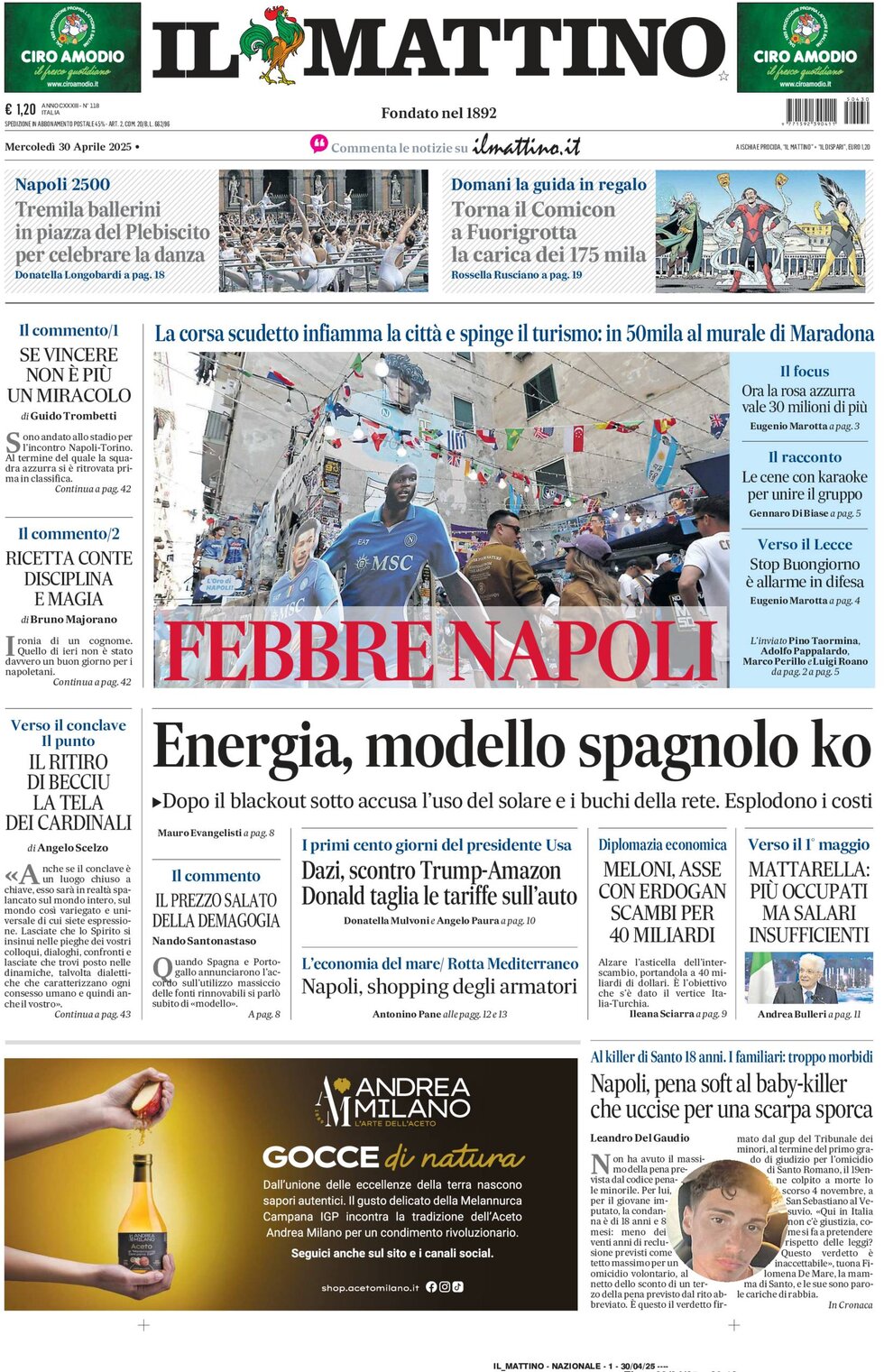 Nell'edizione di oggi, Il Mattino dedica l'apertura in prima pagina alla corsa scudetto tra Napoli e Inter che fa crescere anche il turismo in città: "Febbre Napoli. La corsa scudetto infiamma la città e spinge il turismo: in 50mila al murale di Maradona". Di seguito la prima pagina integrale.