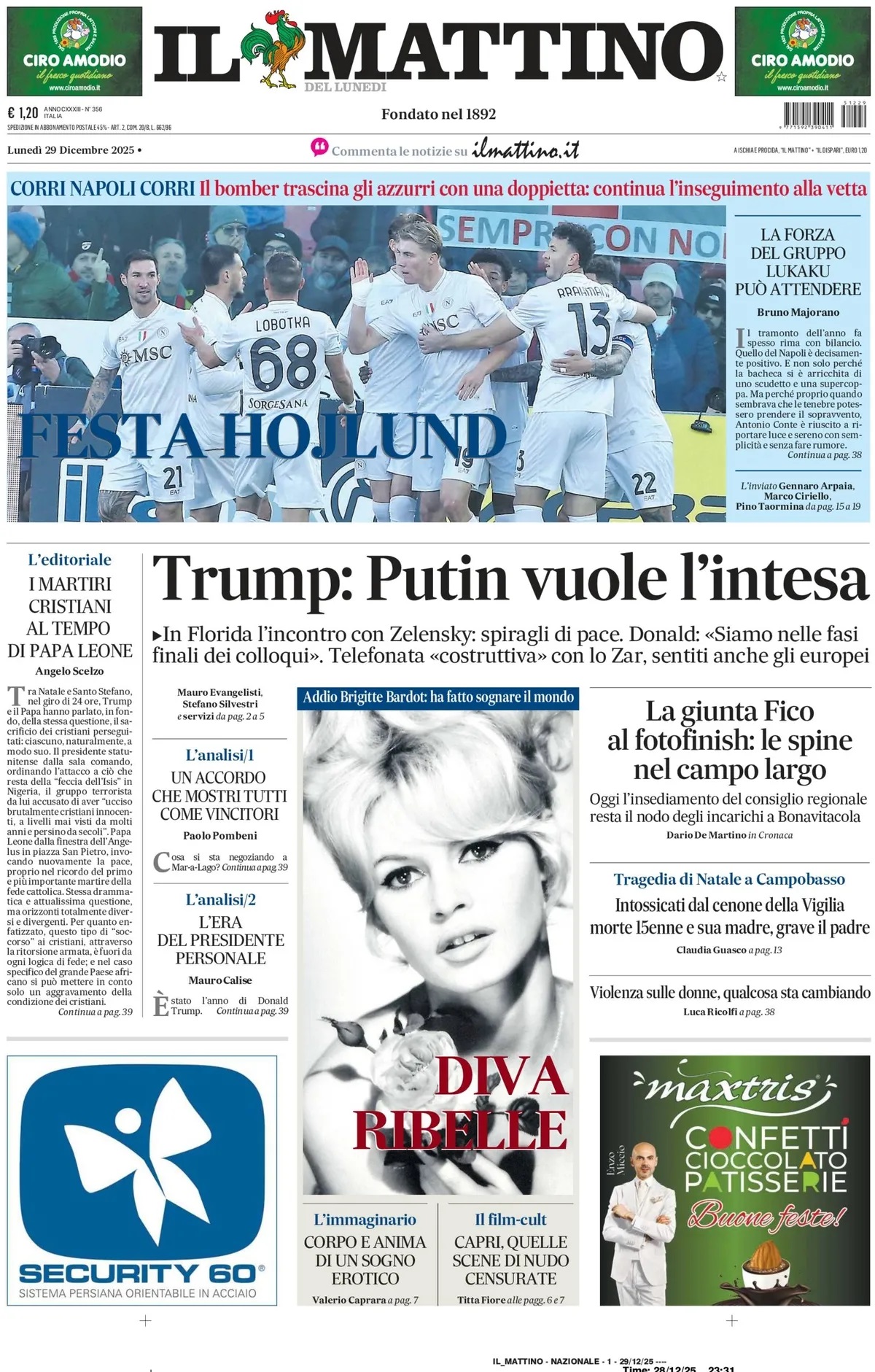Nell'edizione odierna, Il Mattino apre in prima pagina con la vittoria del Napoli a Cremona: "Festa Hojlund. Il bomber trascina gli azzurri con una doppietta: continua l'inseguimento alla vetta". Di seguito la prima pagina integrale.