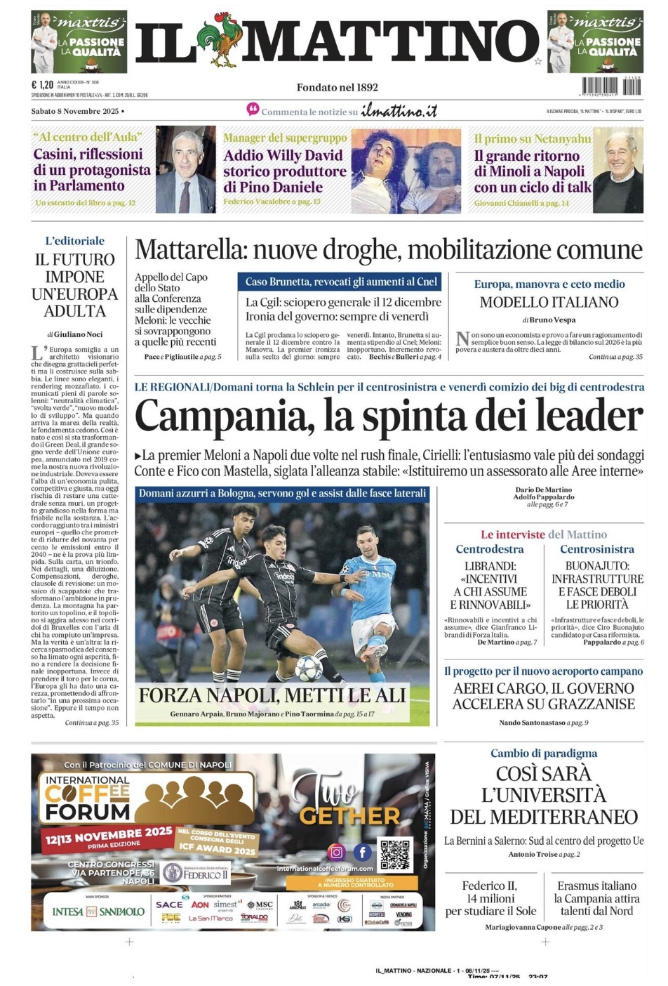 "Forza Napoli, metti le ali", scrive così in prima pagina Il Mattino nell'edizione odierna, in vista della partita di Serie A che attende la squadra di Antonio Conte. Il sommario: "Domani azzurri a Bologna, servono gol e assist dalle fasce laterali". Di seguito la prima pagina integrale.