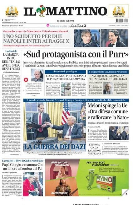 Nell'edizione di oggi, Il Mattino dedica spazio alla lotta scudetto tra Napoli e Inter in prima pagina: "Uno scudetto per due, Napoli e Inter ai raggi x". In taglio alto spazio anche al mercato azzurro con la trattiva Garnacho col Manchester United: "Garnacho, azzurri e Manchester United ancora distanti". Di seguito la prima pagina integrale.
