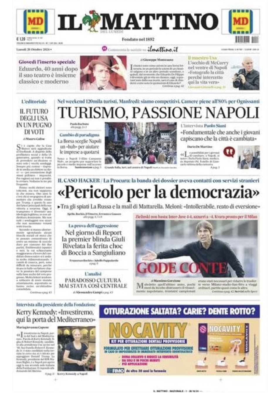 "Gode Conte", apre così in prima pagina l'edizione odierna de Il Mattino, parlando della lotta al vertice in Serie A che dopo il pareggio in Inter-Juve vede gli azzurri avanti rispettivamente 4 e 5 punti sulle pretendenti. Il sommario: "Zielinski non basta: Inter Juve 4-4, azzurri a +4. Kvara pronto per il Milan". Di seguito la prima pagina integrale.