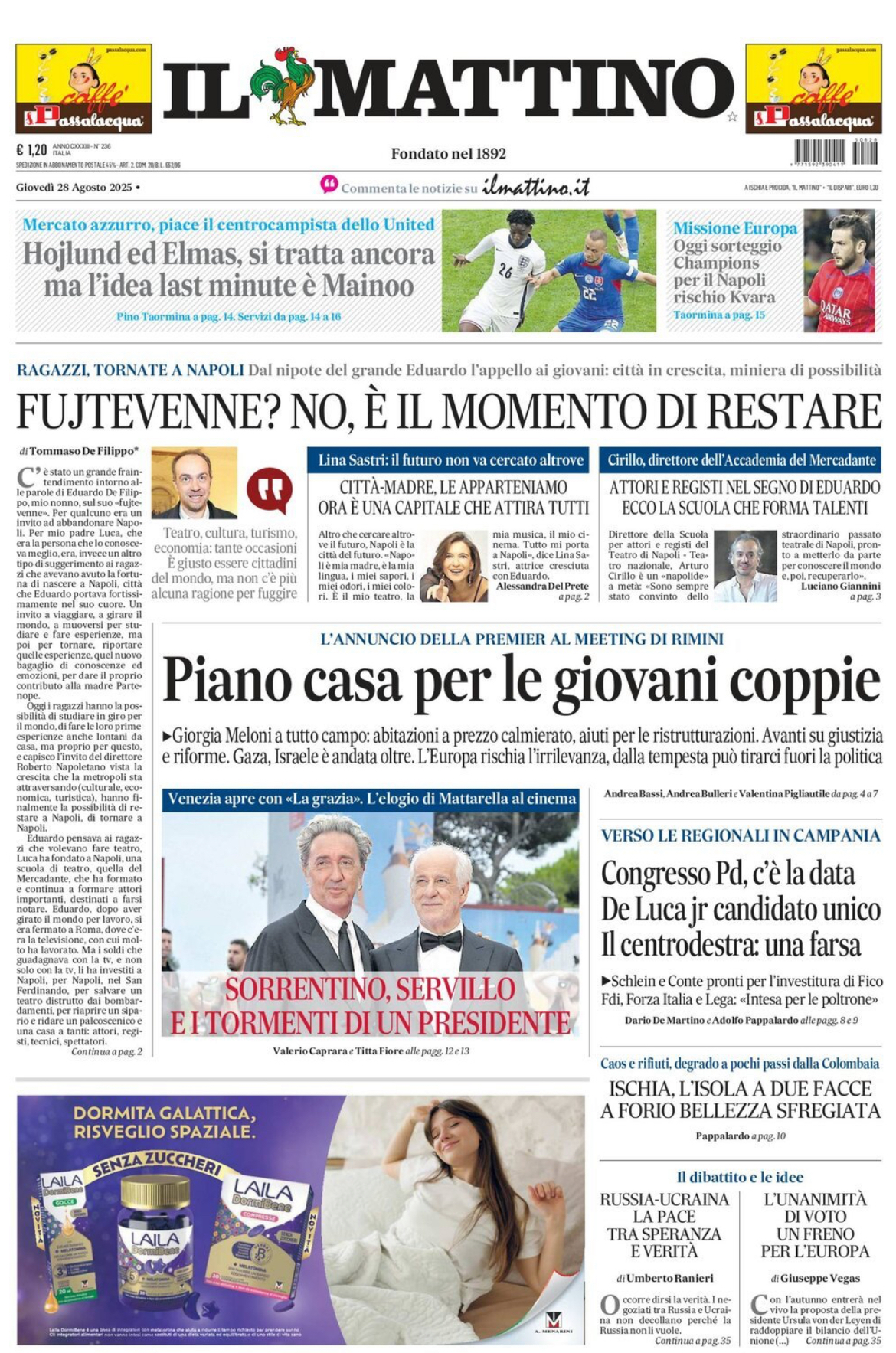 “Hojlund ed Elmas, si tratta ancora: l’idea last minute è Mainoo”, apre così in prima pagina Il Mattino nell'edizione odierna, parlando del mercato del Napoli. Spazio anche al sorteggio Champions in programma oggi a partire dalle 18: “Missione Europa. Oggi sorteggio Champions, per il Napoli rischio Kvara”. Di seguito la prima pagina integrale.
