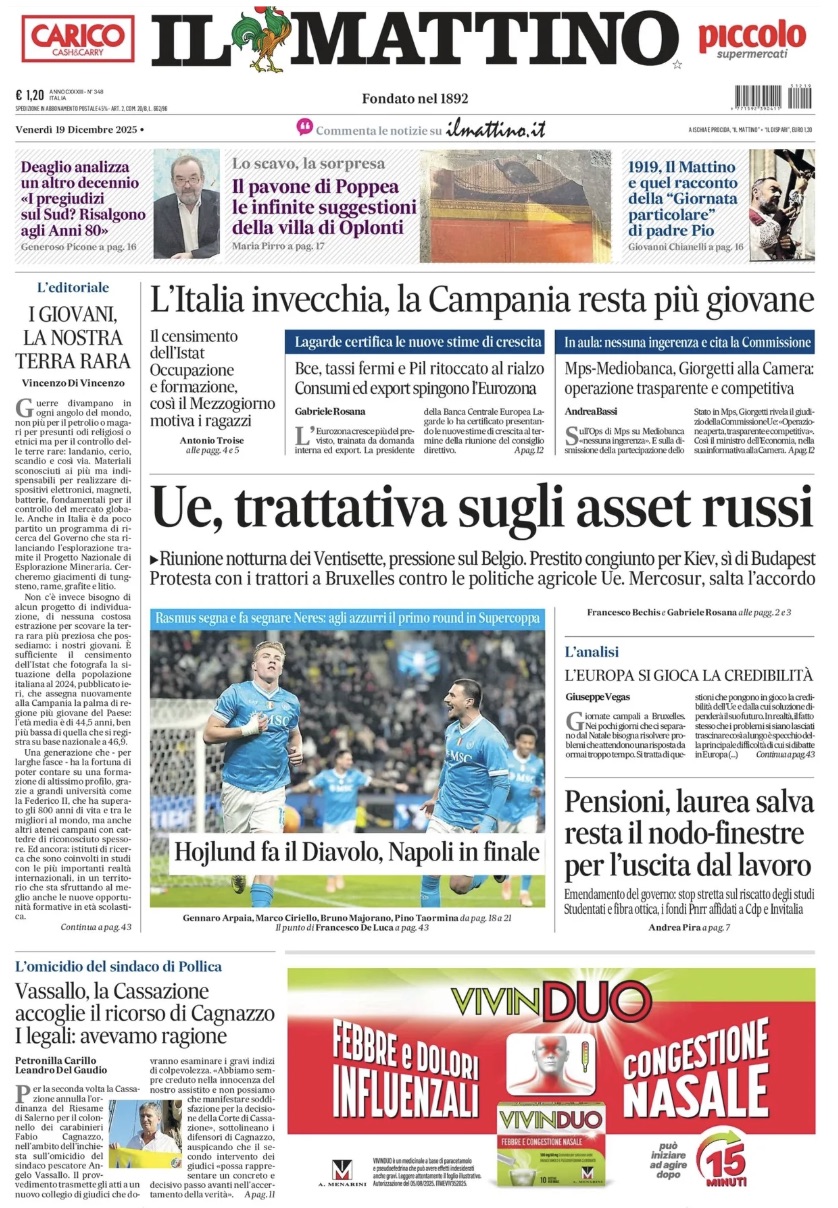 "Hojlund fa il Diavolo, Napoli in finale", scrive così in prima pagina Il Mattino nell'edizione odierna, commentando la vittoria della squadra di Antonio Conte contro il Milan. Il sommario: "Rasmus segna e fa segnare Neres: agli azzurri il primo round in Supercoppa". Di seguito la prima pagina integrale.