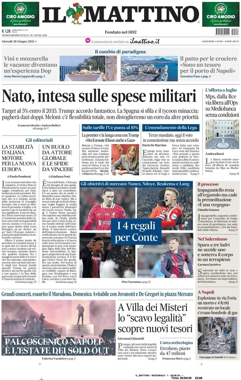 Nell'edizione di oggi, Il Mattino dedica spazio al mercato del Napoli in prima pagina: "I 4 regali per Conte. Gli obiettivi di mercato: Nunez, Ndoye, Beukema e Lang". In primo piano spazio al vertice Nato e all'accordo sulle spese per le armi: "Nato, intesa sulle spese militari". Di seguito la prima pagina integrale.
