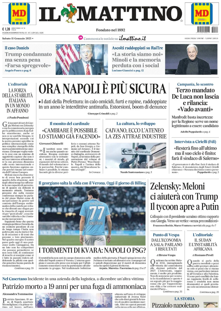 "I tormenti di Kvara: Napoli o PSG?". Questo il titolo in prima pagina dell'edizione odierna de Il Mattino. Sono giorni molto intensi per Khvicha Kvaratskhelia. L'attaccante georgiano è molto richiesto dal Paris Saint-Germain che starebbe per strapparlo al Napoli. Intanto contro il Verona non dovrebbe essere in campo a causa sempre di un affaticamento muscolare.