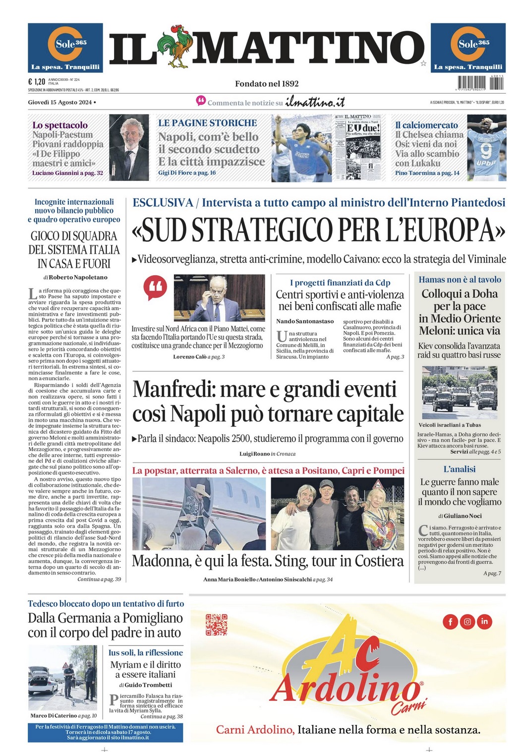 Nell'edizione di oggi, Il Mattino apre in prima pagina con il mercato del Napoli e il possibile scambio con il Chelsea Osimhen-Lukaku: "Il Chelsea chiama Osi: vieni da noi. Via allo scambio con Lukaku". In taglio alto tra le prime pagine storiche del quotidiano di oggi quella riguardante al secondo scudetto del Napoli nel 1990: "Napoli, com'è bello il secondo scudetto. E la città impazzisce". Di seguito la prima pagina integrale.