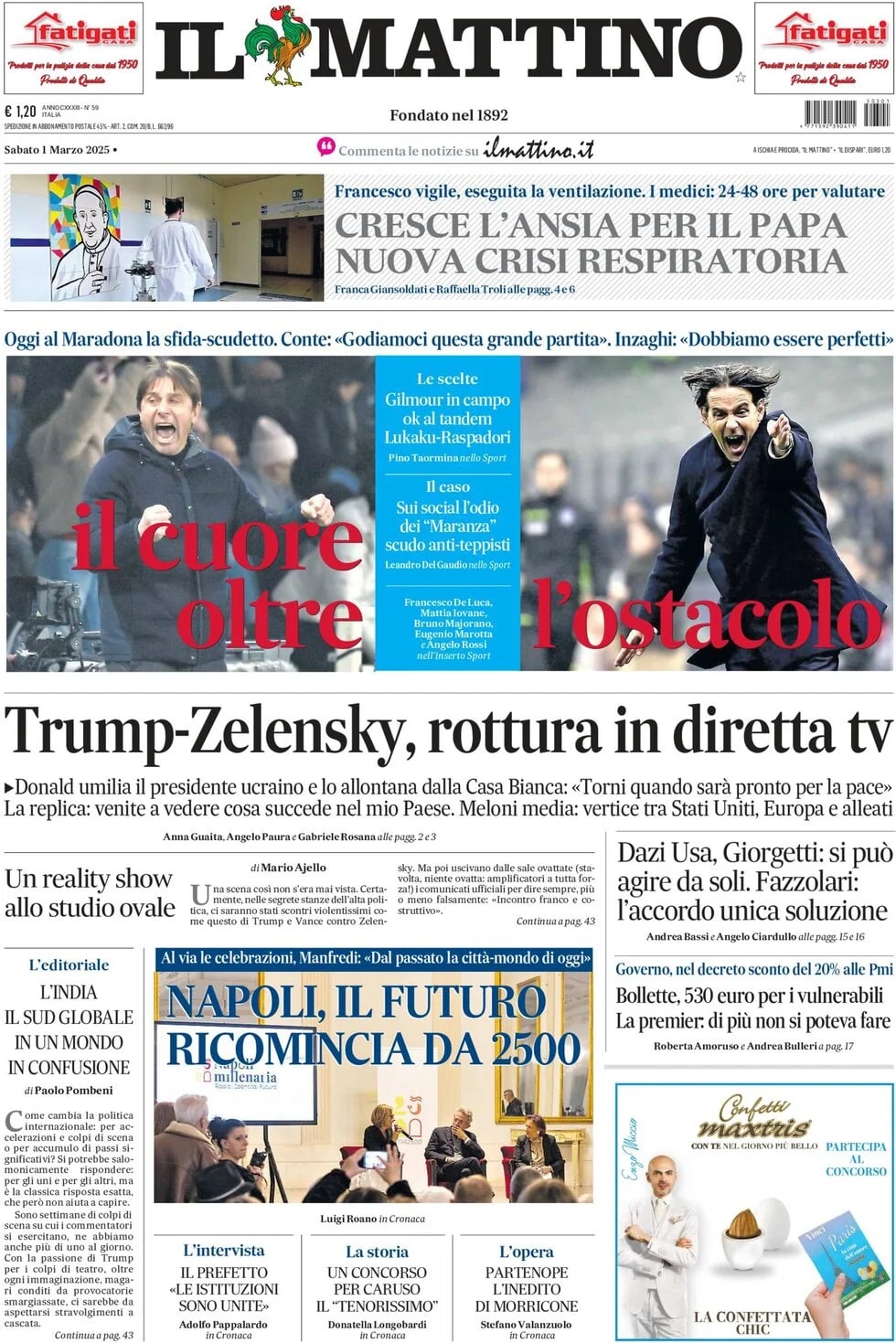 "Il cuore oltre l'ostacolo" scrive Il Mattino in apertura in vista della super-sfida Scudetto tra Napoli e Inter in programma quest'oggi alle ore 8 allo stadio Maradona. Conte: "Godiamoci questa grande partita". Inzaghi: "Dobbiamo essere perfetti". Napoli pronto a tornare al 3-5-2 con Gilmour in campo al posto di Anguissa. Ok al tandem Lukaku-Raspadori in attacco. I nerazzurri invece ritrovano Thuram dal 1' minuto