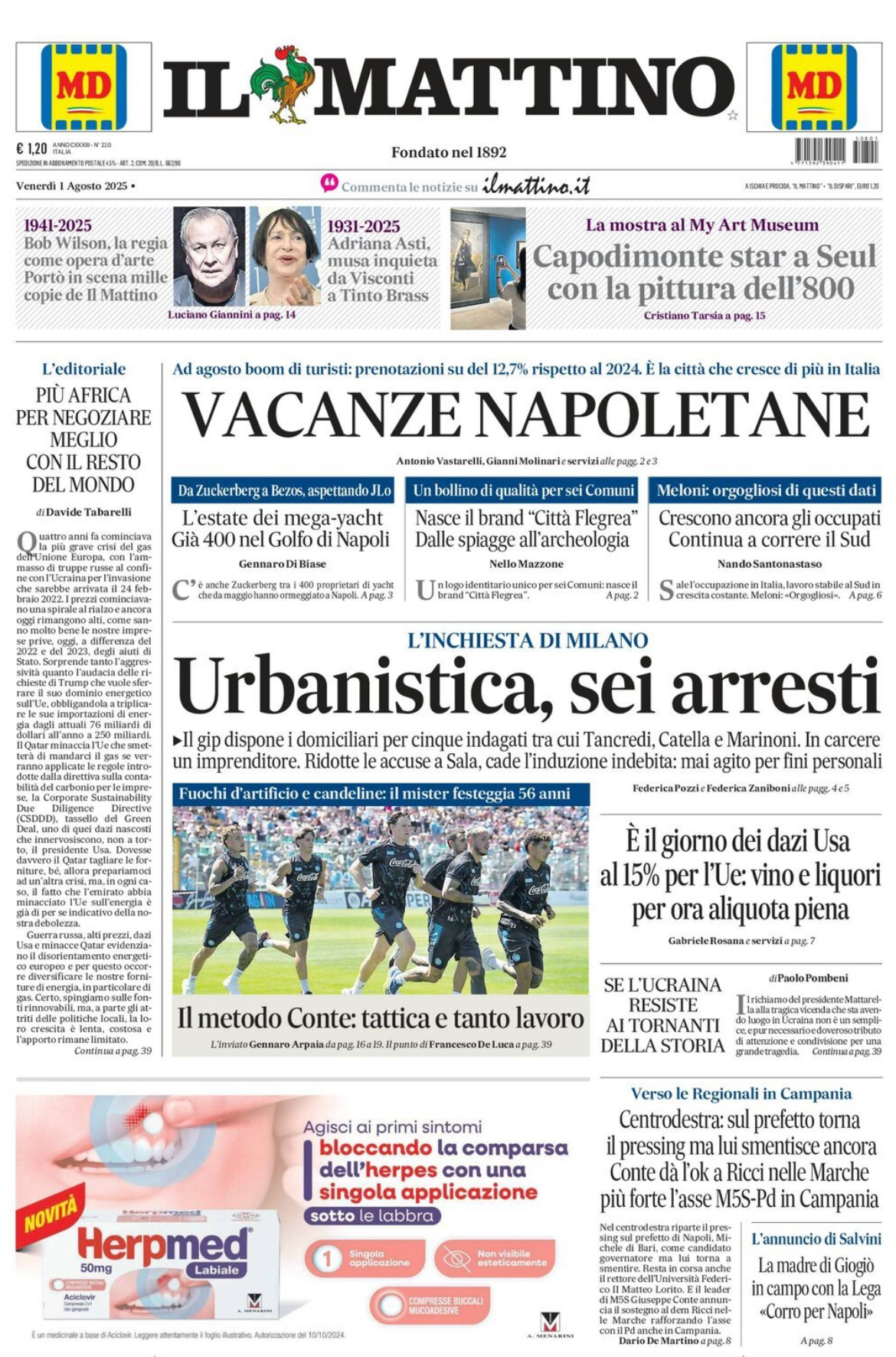 Nell'edizione di oggi, Il Mattino dedica ampio spazio al Napoli, oggi alle prese con il terzo giorno di allenamenti in Abruzzo, a Castel di Sangro, sede del secondo ritiro di preparazione estiva: “Il metodo Conte: tattica e tanto lavoro. Fuochi d’artificio e candeline: il mister festeggia 56 anni”. Di seguito la prima pagina integrale.