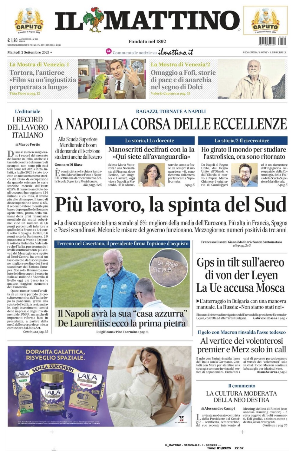 "Il Napoli avrà la sua casa 'azzurra'. De Laurentiis: ecco la prima pietra", scrive così in prima pagina Il Mattino nell'edizione odierna, parlando del nuovo centro sportivo del club partenopeo. Il sommario: "Terreno nel Casertano, il presidente firma l'opzione d'acquisto". Di seguito la prima pagina integrale.