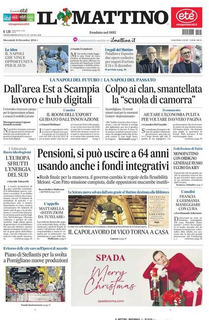 Nell'edizione di oggi, Il Mattino dedica spazio al Napoli in prima pagina nell'editoriale del professor Guido Trombetti: "Il Napoli che vince: opportunità per il sud". In apertura la Napoli del futuro e del passato: "Dall'area Est a Scampia: lavoro e hub digitali". "Colpo ai clan, smantellata la 'scuola' di Camorra". Di seguito la prima pagina integrale.
