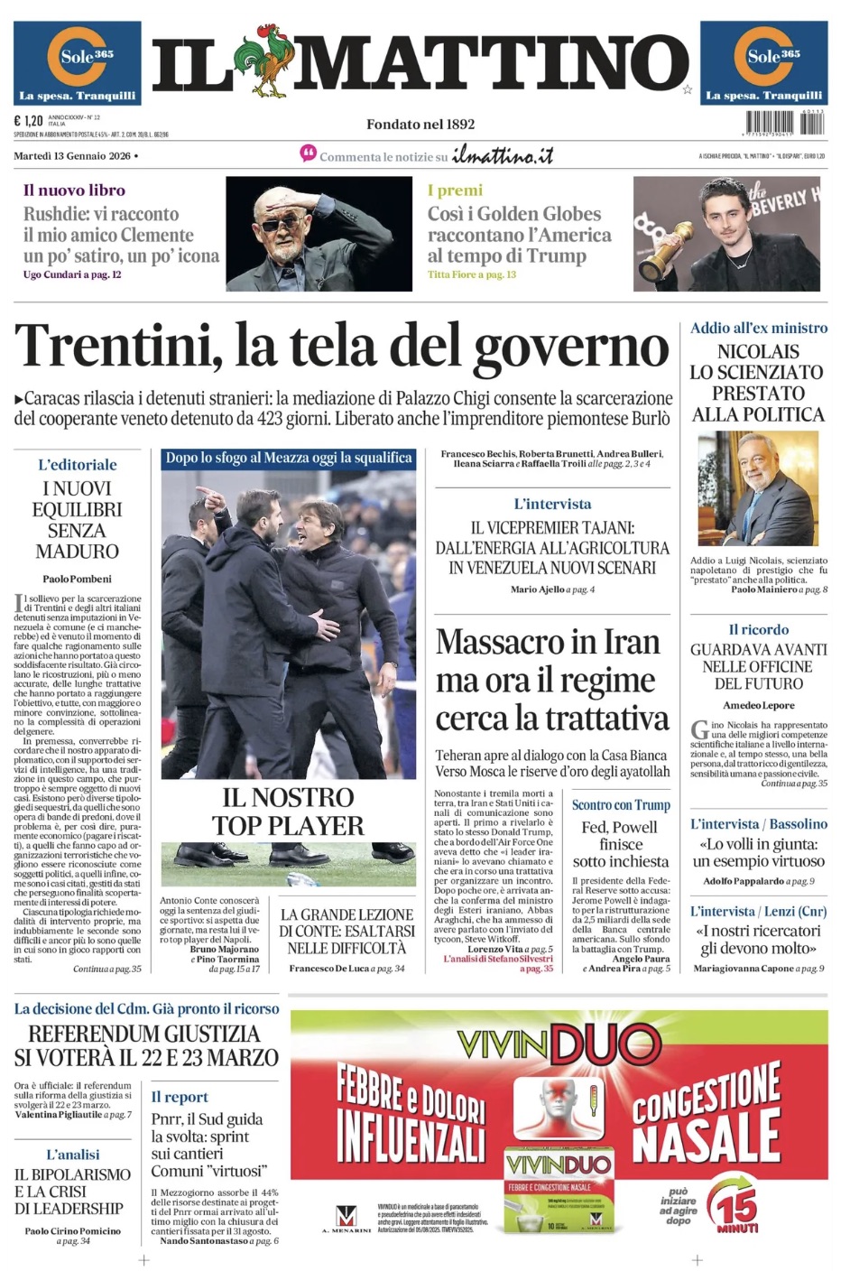 "Il nostro Top Player. Dopo lo sfogo al Meazza oggi la squalifica", scrive così in prima pagina Il Mattino nell'edizione odierna, facendo riferimento ad Antonio Conte ed alla sua reazione per cui è stato espulso in Inter-Napoli. Di seguito la prima pagina integrale.