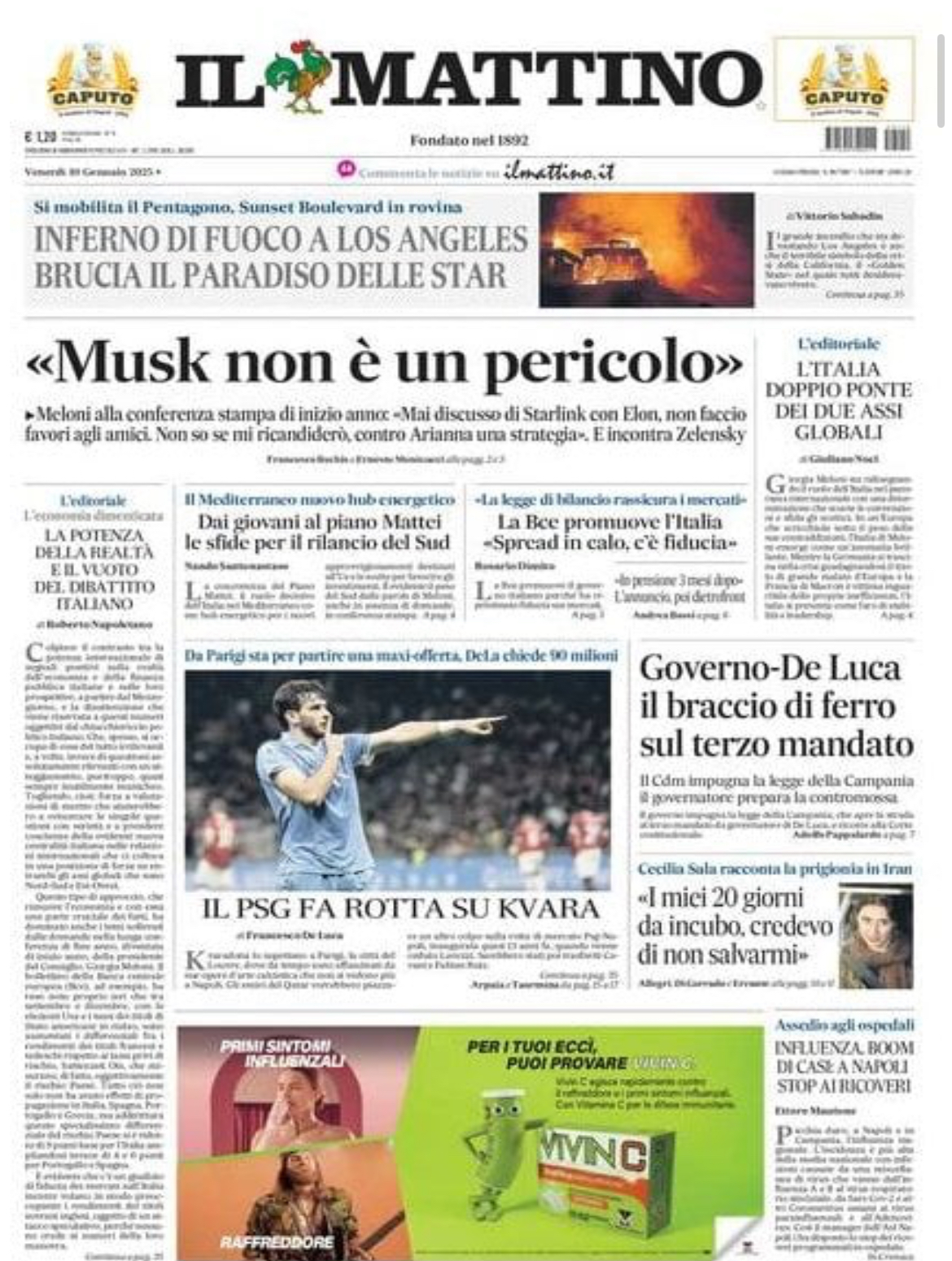Nell'edizione di oggi, Il Mattino dedica spazio in prima pagina all’assalto del Paris Saint Germain nei confronti di Khvicha Kvaratskhelia: “Il PSG fa rotta su Kvara. Da Parigi sta per partire una maxi-offerta. DeLa chiede 90 milioni”. Di seguito la prima pagina integrale.