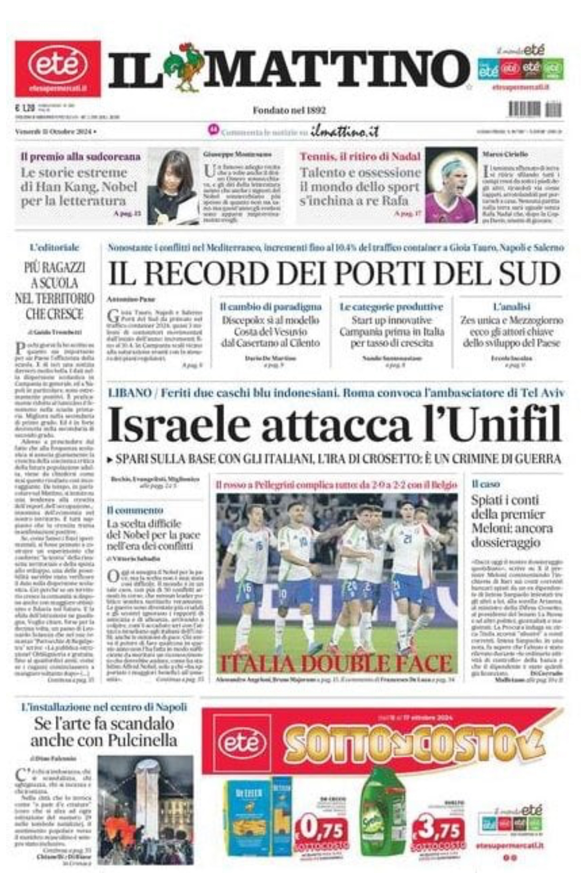 Nell'edizione di oggi, Il Mattino dedica spazio in prima pagina alla Nazionale, che ha pareggiato 2-2 il match di Nations League contro il Belgio: “Italia double face. Il rosso a Pellegrini complica tutto: da 2-0 a 2-2 con il Belgio”. Di seguito la prima pagina integrale.