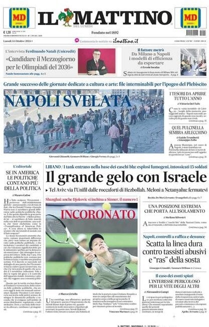 Nell'edizione di oggi, Il Mattino dedica spazio alla Nazionale, trascinata dagli azzurri del Napoli contro Israele: "ItalNapoli. Nations, azzurri ok contro Israele (4-1): doppietta di Di Lorenzo". In apertura il boom turistico in Campania, con il record di turisti in regione: "Campaniamania". Di seguito la prima pagina integrale.
